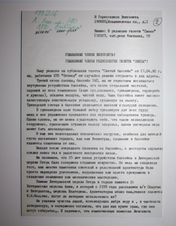 Стенды, посвященные истории здания в советские десятилетия На стенде с фото, где запечатлен исторический момент передачи здания верующим, а также первые богослужения в зале, где шли работы по перекрытию чаши бассейна, есть еще один любопытный документ. Это письмо от работников ПТО «Оптика» от 25 апреля 1990 года. Оно адресовано в Ленсовет, с копией в газету «Смена». В нем сотрудники «Оптики» просят, по возможности, сохранить бассейн в здании Петрикирхе, выходя из которого, «с восторгом ощущаешь прилив новых сил и радостного восприятия жизни». В крайнем случае, если это всё-таки окажется невозможным, работники производственно-технического отдела предлагают сначала построить новый бассейн для Балтийского морского пароходства и лишь после этого закрыть имеющийся. И, наконец, завершает экспозицию первый стенд об истории собора свв. Петра и Павла, который в 1989 году сделал Совет Петрикирхе, собиравшийся при стоящей рядом школе № 222 (Петришуле). На нем от руки написан текст, и приклеены отксерокопированные изображения. Среди задач Совета – выселение из здания бассейна и возрождение общины.