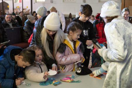 Кульминацией праздника для детей стало совместное украшение рождественской елки бумажными шариками с пожеланиями.