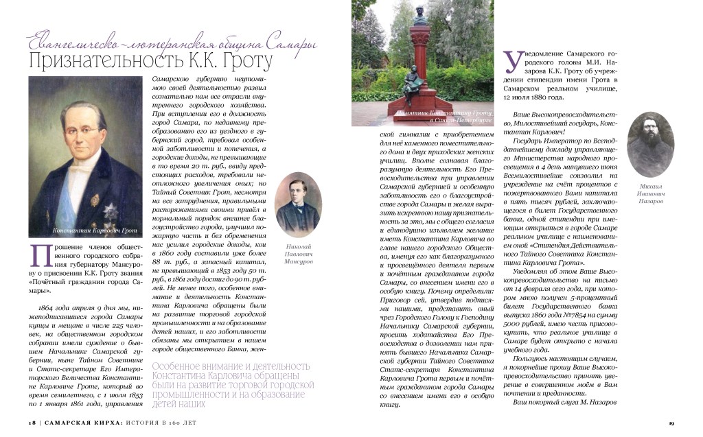 За последнее время самарские лютеране отпраздновала три юбилейные даты – 210-летие со дня рождения основателя общины Константина Грота, 170-летие существования общины и 160-летие освящения церкви св. Георга. В связи с этим у общины св. Георга была мечта издать книгу о комплексе лютеранской кирхи и об общине, осветив при этом деятельность Константина Грота – одного из первых губернаторов Самары. Община приняла участие в конкурсе на субсидирование некоммерческих организаций, осуществляющих социально-значимую деятельность на территории городского округа (г. о.) Самары, и получила субсидию, которая позволила написать и издать информативную, наглядную и очень красочную книгу.