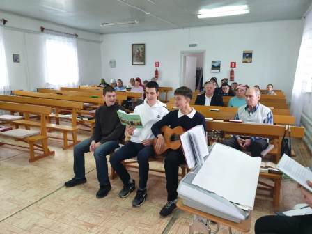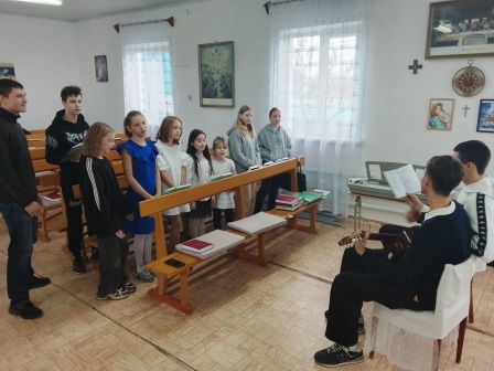 Гости исполняют христианские песнопения вместе с детьми общины Лебяжьего.