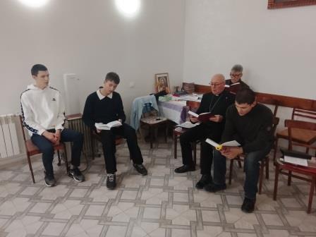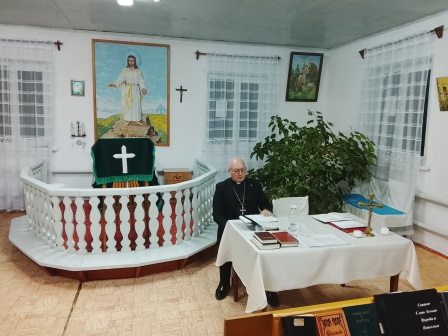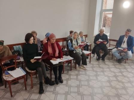 Пропст Якоб Рюб проводит библейский час в молитвенном доме общины Лебяжьего.