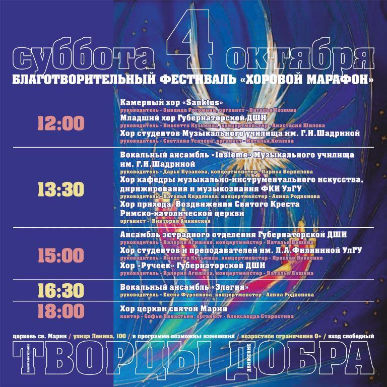 Хоровой марафон в помощь хосписуУльяновск. 4 октября в церкви св. Марии прошел благотворительный фестиваль «Хоровой марафон». В течение семи часов под сводами храма пели лучшие хоровые коллективы города: от совсем юных дарований до признанных мастеров. В программу вошли как классические произведения, так и хоровые интерпретации популярных песен. В этом году у фестиваля была важная благотворительная цель. Весь день в церкви собирали пожертвования для пациентов Ульяновского областного хосписа. Таким образом, каждый зритель, наслаждаясь искусством, мог также сделать доброе дело и подарить капельку надежды и заботы тем, кто особенно в них нуждается.