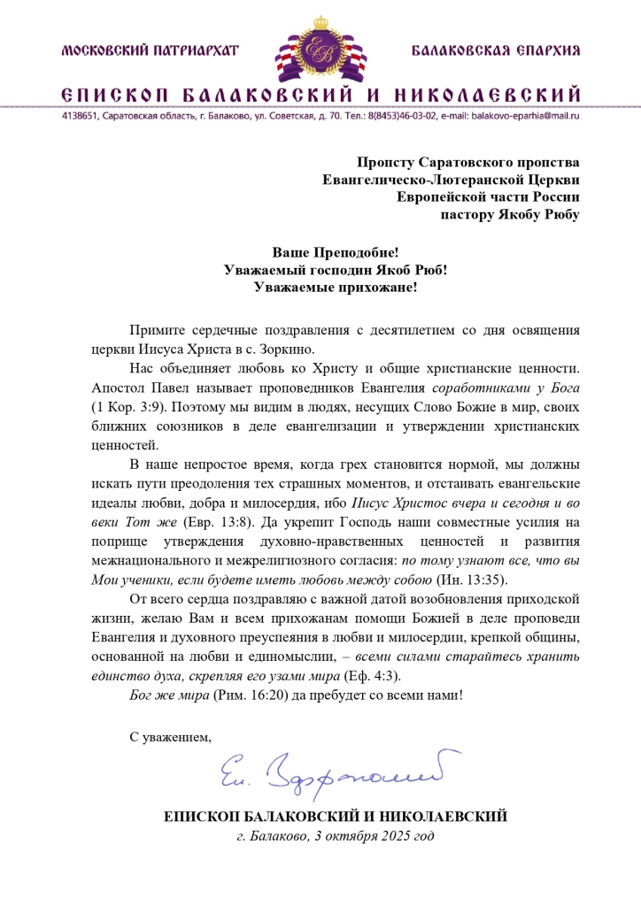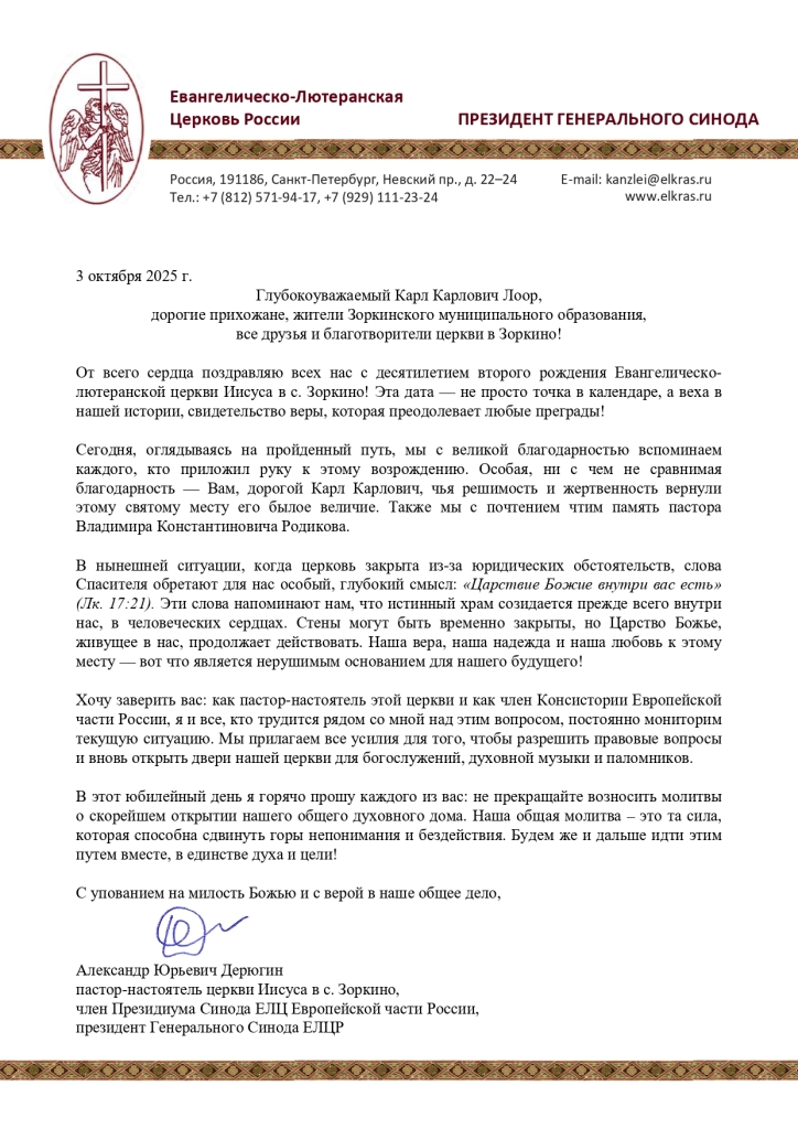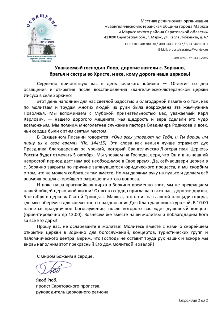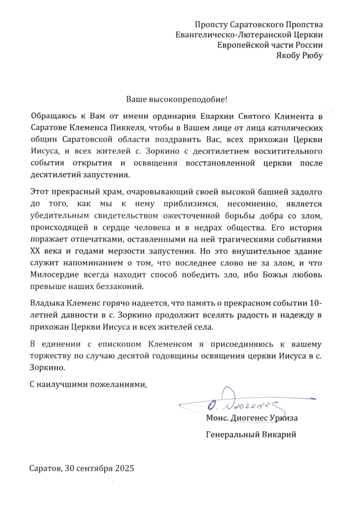 Виртуальный юбилей: десятилетие освящения церкви Иисуса в ЗоркиноЗоркино. 3 октября в Саратовском пропстве отметили десятилетие восстановления из руин и освящения церкви Иисуса в с. Зоркино Марксовского р-на Саратовской обл. Это здание является памятником регионального значения, объектом культурного наследия народов РФ и точной копией несохранившегося лютеранского собора св. Марии в Саратове (в зоркинской церкви было лишь одно отличие – наличие башенных часов, и она старше саратовской). К сожалению, в настоящий момент комплекс, включающий саму церковь и паломнический центр, временно закрыт Минюстом с 16 января 2025 года – из-за начала активной стадии юридического процесса перехода прав собственности после ухода из жизни в 2024 году единственного учредителя и руководителя Фонда «Цюрих-Зоркино» пастора Владимира Родикова. Поэтому этот юбилей отпраздновали виртуально: ограничились лишь объявлением в интернете о знаменательной дате – без каких-либо торжеств в самой церкви. Тем не менее с юбилеем поздравили не только единоверцы, но и духовенство православной и католической Церквей.