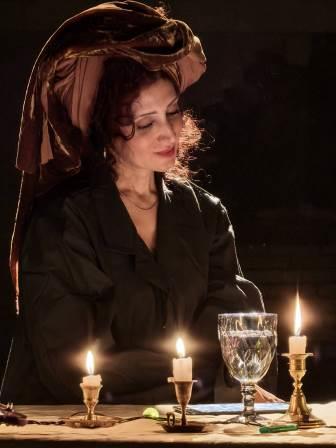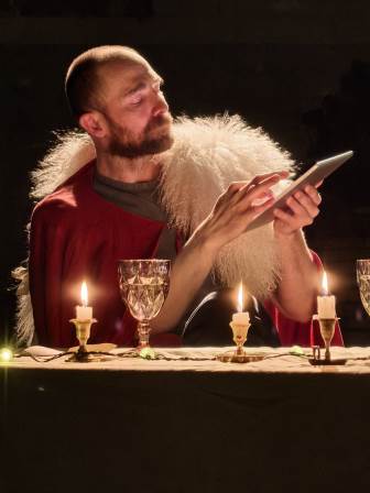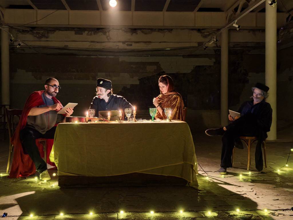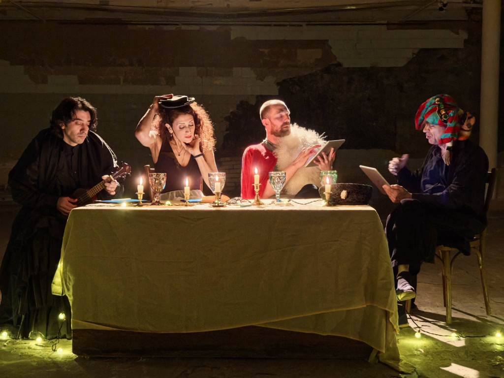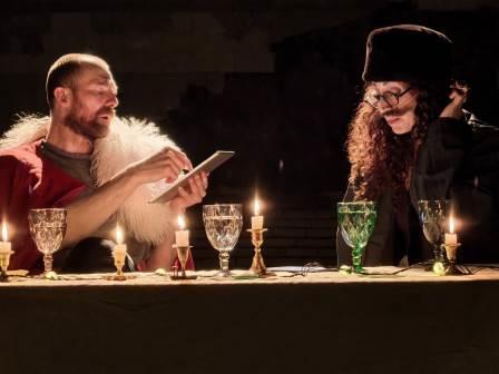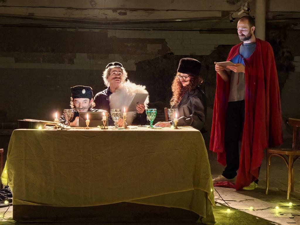 Текст пьесы – написанный на 137 страницах на старорусском языке – был значительно сокращен и переработан труппой «Театро ди Капуа». Ведь оригинальное представление в придворном театре длилось десять часов без антракта, а участвовало в нем 60 актеров! В постановке «Театро ди Капуа» задействовано только четверо актеров, каждый из которых исполняет несколько ролей. Среди них и режиссер театра Джулиано ди Капуа. А спектакль длится около полутора часов. Илона Маркарова упомянула и о том, что в этом году исполняется десять лет, с тех пор как Петрикирхе стала домом для «Театро ди Капуа». Сегодня бóльшая часть его постановок идет в катакомбах собора. Она подчеркнула, что для актеров важно такое сотрудничество еще и потому, что возникновение театра в России напрямую связано с немецкой лютеранской Церковью – благодаря деятельности пастора Грегори.